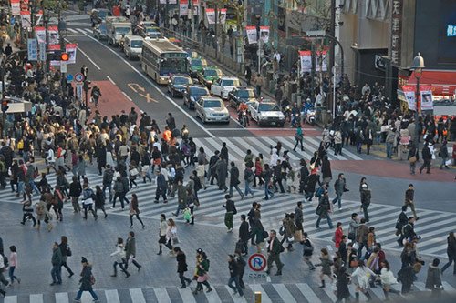 The famous intersection outside Shibuya station in Tokyo, Japan, is one of the busiest in the world, and can be an intense experience for first-time visitors.  When the lights go red, traffic stops completely as hundreds, even thousands of pedestrian cross from every direction.  An incredible sight to see on busy afternoons.