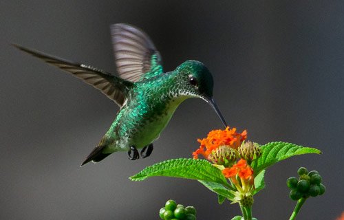 A hummingbird extracts some nectar during a summer evening. Excellent focus in this photo.