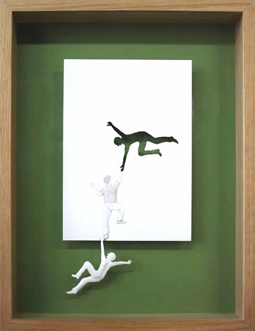 The paper cut sculptures explore the probable and magical transformation of the flat sheet of paper into figures that expand into the space surrounding them. The negative and absent 2 dimensional space left by the cut, points out the contrast to the 3 dimensional reality it creates, even though the figures still stick to their origin without the possibility of escaping. In that sense there is also an aspect of something tragic in many of the cuts.